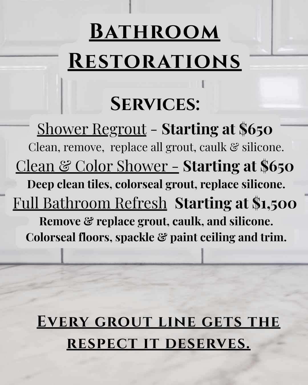 Sign advertising bathroom restoration services with pricing for shower reglazing, shower and color cleaning, and full bathroom refresh, set against a tiled wall background.