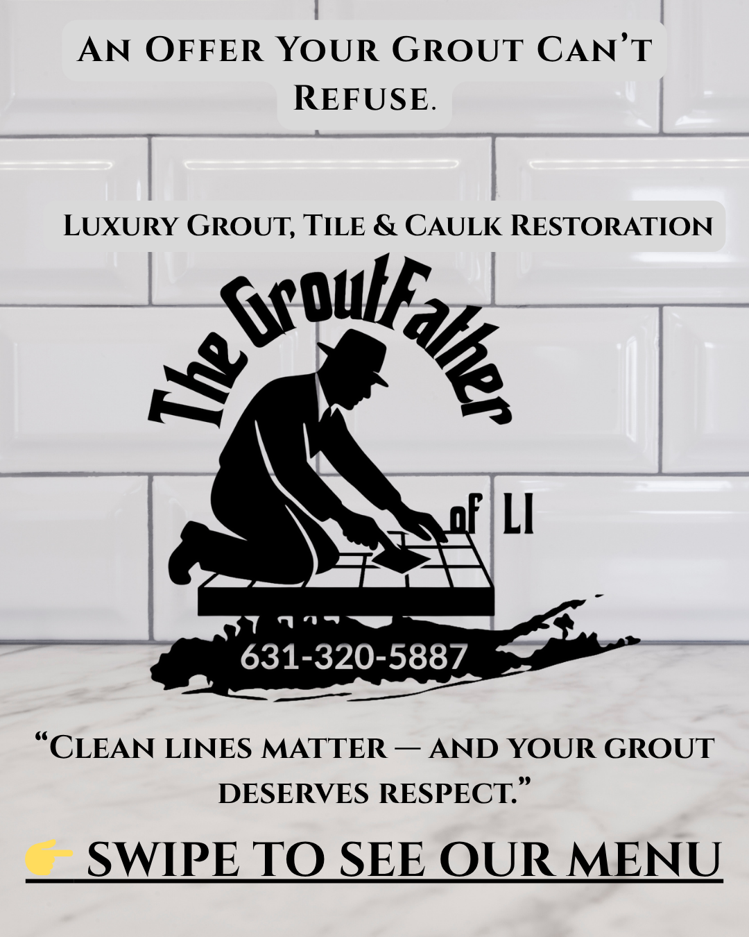 Advertisement for The GroutFather, offering luxury grout, tile, and caulk restoration services, featuring a black silhouette of a man kneeling and working on grout, with the text 'An Offer Your Grout Can't Refuse', phone number 631-320-5887, and a prompt 'Swipe to see our menu' with a pointing finger icon.